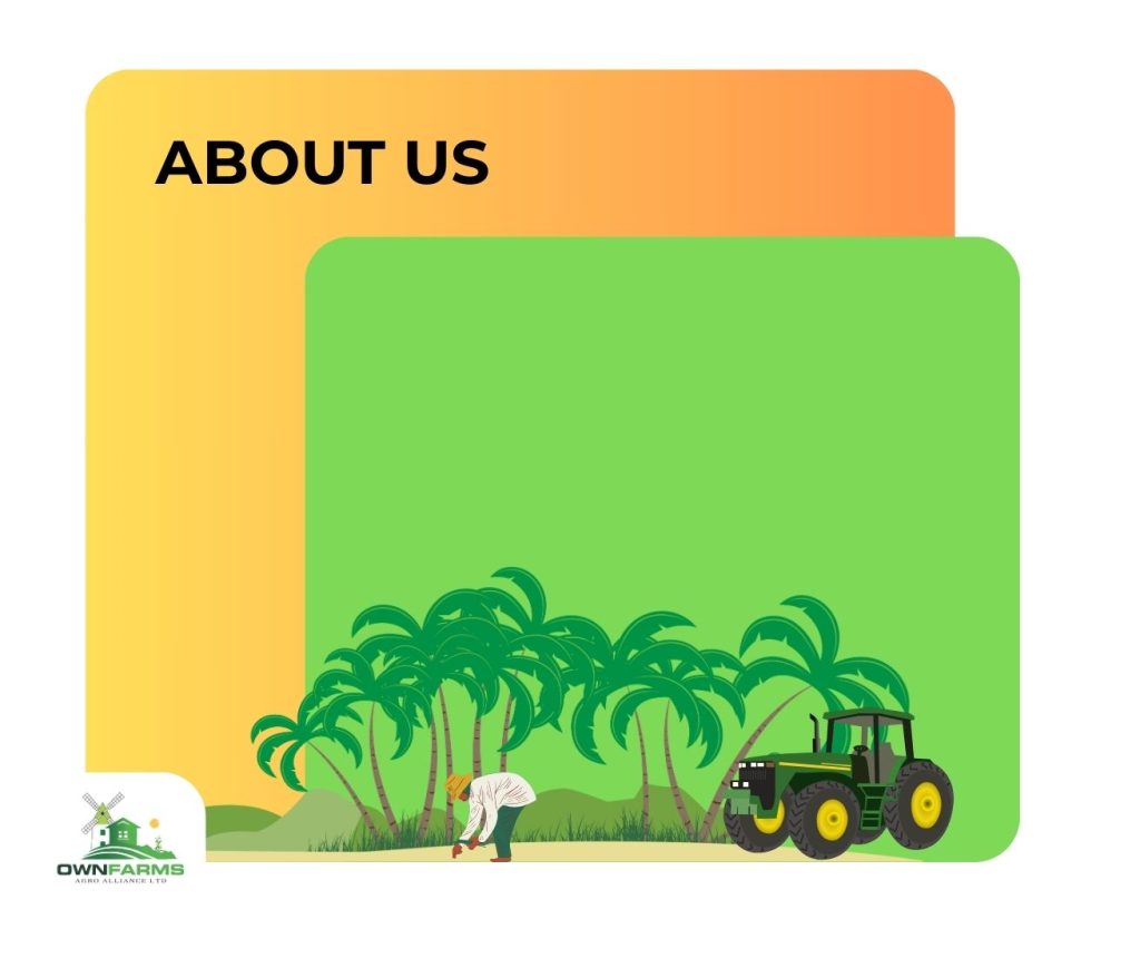 OWNFARMS AGRO ALLIANCE LTD. is a comprehensive agricultural solutions provider, serving clients around the world who are interested in farming. Registered with Nigeria Corporate Affairs with registration number RC 8441033. We specialize in farmland acquisition, institutional and community farming, agricultural consulting, and more.